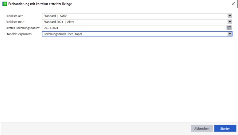 Im Korrekturassistenten müssen die alte (bisherige) Preisliste, die neue Preisliste, das datum der letzten Rechnung die noch mit alten Preisen erstellt wurde sowie der passende Stapeldruckprozess ausgewählt werden.